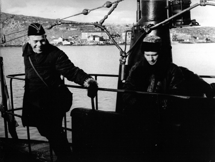 Возвращение подводной лодки «М-172», командир 4-го дивизиона ПЛ СФ Н.И. Морозов и командир подлодки И.И. Фисанович.15 сентября 1941 г.
