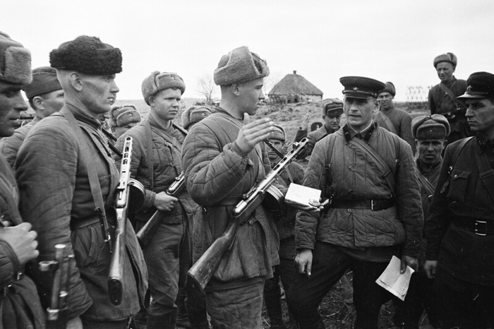 Из воспоминаний писателя Константина Симонова о встрече на фронте с бойцами дивизии народного ополчения: «В следующей деревне мы встретили части одной из московских ополченских дивизий, кажется, шестой. Помню, что они тогда произвели на меня тяжелое впечатление... Думал: неужели у нас нет никаких других резервов, кроме вот этих ополченцев, кое-как одетых и почти не вооруженных? Одна винтовка на двоих и один пулемет. Это были по большей части немолодые люди по сорок, по пятьдесят лет. Они шли без обозов, без нормального полкового и дивизионного тыла — в общем, почти что голые люди на голой земле. Обмундирование — гимнастерки третьего срока, причем часть этих гимнастерок была какая-то синяя, крашеная. Командиры их были тоже немолодые люди, запасники, уже давно не служившие в кадрах. Всех их надо было еще учить, формировать, приводить в воинский вид».