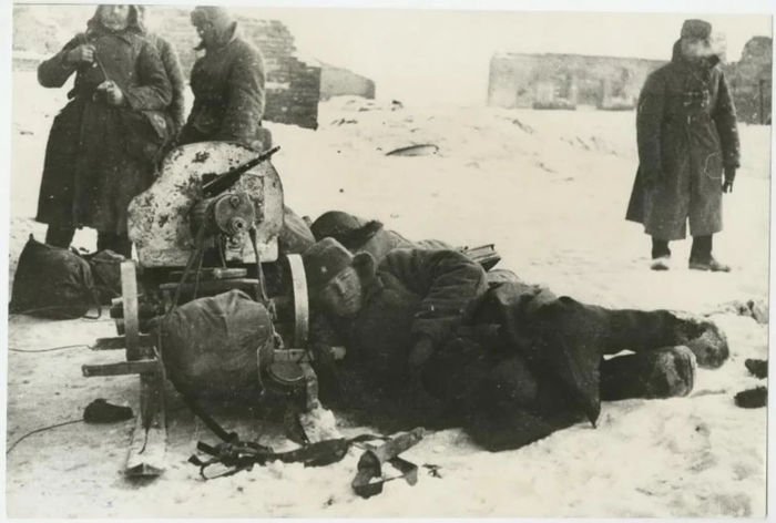 Следующее фото сделано в Сталинграде. Историки сообщают, что в ноябре-декабре 1942 года температура там нередко опускалась до - 20-30°С, а во второй половине января и феврале 1943 г. порой доходила до - 40-45 градусов.
