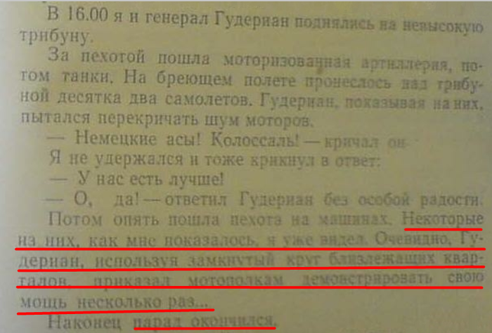 Надо признать, продукт немецких пропагандистов–хроникеров из взвода пропаганды, снимавших прощальный парад, а потом смонтировавших ролик из мелкой нарезки хроники вперемешку с советскими танками, создающий впечатление одновременности событий, удался. Действует на неокрепшие умы до сих пор.