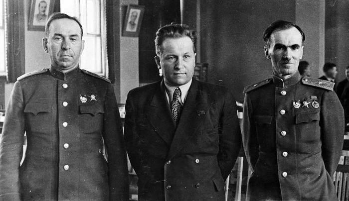 Организаторы Уральского добровольческого танкового корпуса генерал-лейтенант танковых войск Г.С. Родин, секретарь Свердловского обкома ВКП (б) В.М. Андрианов и командующий войсками Уральского военного округа генерал-майор А.В. Катков, 1943 год