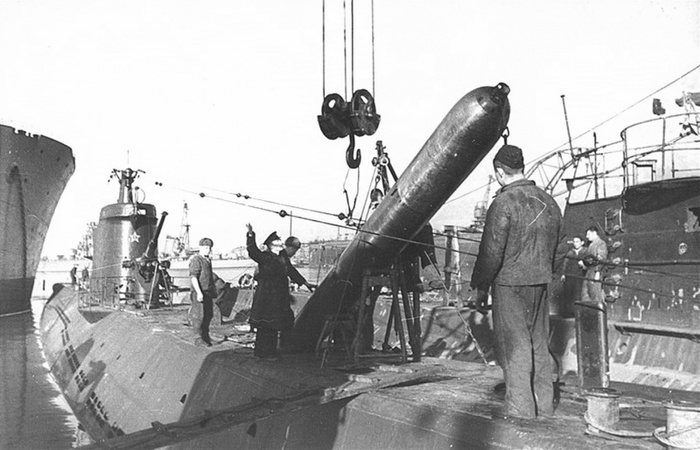 Погрузка торпеды на советскую подводную лодку Л-23 в порту Поти по руководством командира БЧ-3 старшего лейтенанта И.С. Пятинского. 1943 г.
