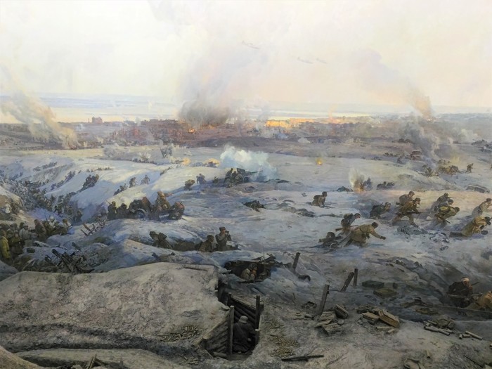 Побродив по нижним залам, поднимаемся по лестнице к тематическому центру музея -  к панораме Сталинградская битва. И вот тут нам повезло! Нас вдруг обгоняет экскурсионная группа с девушкой-гидом. Конечно, мы стали слушать ее, и очень хорошо она рассказывала! Слушаешь ее, и слёзы подступают к горлу... Мы оказываемся в центре круговой диорамы и смотрим на всю картину вокруг нас сверху вниз, так как мы будто находимся на самой высокой точке 102 метра - на Мамаевом кургане. Нам рассказывают, как и кем создавалось это произведение, а затем мы узнаём, что каждый кусочек картины - это реальные эпизоды сталинградской битвы, реальные люди. Вот например, помните листовку о подвиге Матвея Путилова? А это вот он лежит по центру рядом с проводом...