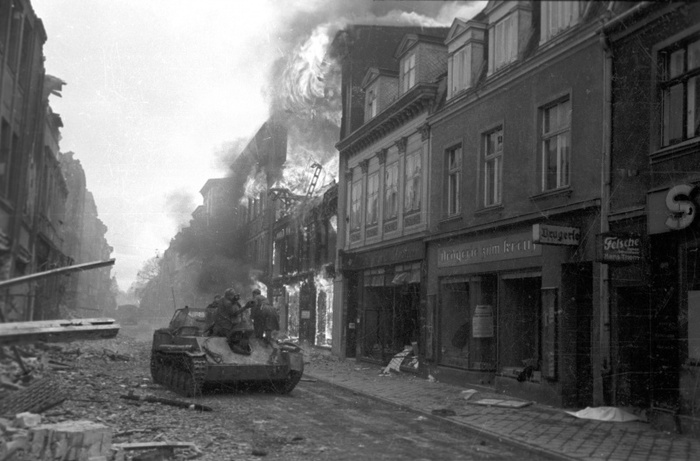 Советская САУ СУ-76М прокладывает дорогу бойцам штурмовых групп на улице горящего Данцига (ныне — Гданьск, Польша). Март 1945 г.