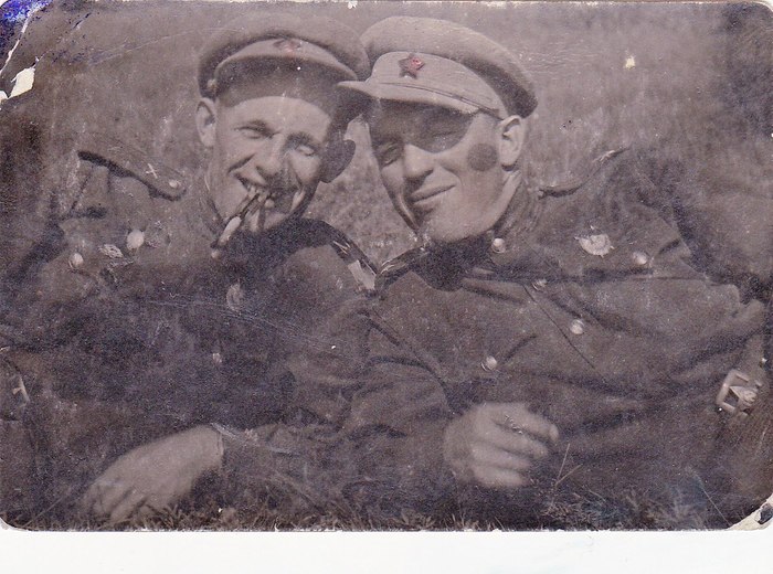На фото: Буряк летом 1943 года курит трубку с товарищем, сам Тихон Григорьевич слева.