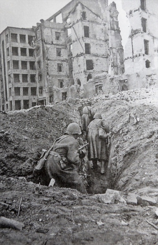 Бойцы 13-й гвардейской дивизии продвигаются по ходу сообщения во дворе комплекса НКВД в Сталинграде. сентябрь 1942 г.