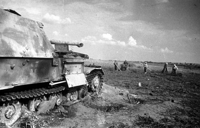 одбитая немецкая САУ «Фердинанд» и советские колхозники за работой в поле. Район станции Поныри. 1943 г.