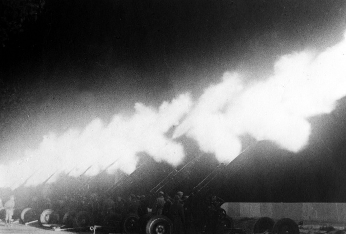 Салют в Москве в честь освобождения Харькова. Салют ведется из 85-мм зенитных орудий 52-К.