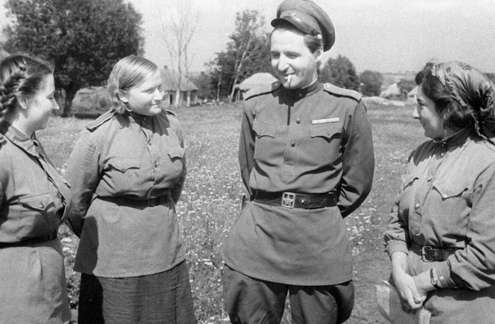 Корреспондент газеты «Красная звезда» Константин Михайлович Симонов (1915—1979) общается с санитарками госпиталя. 1943 г.