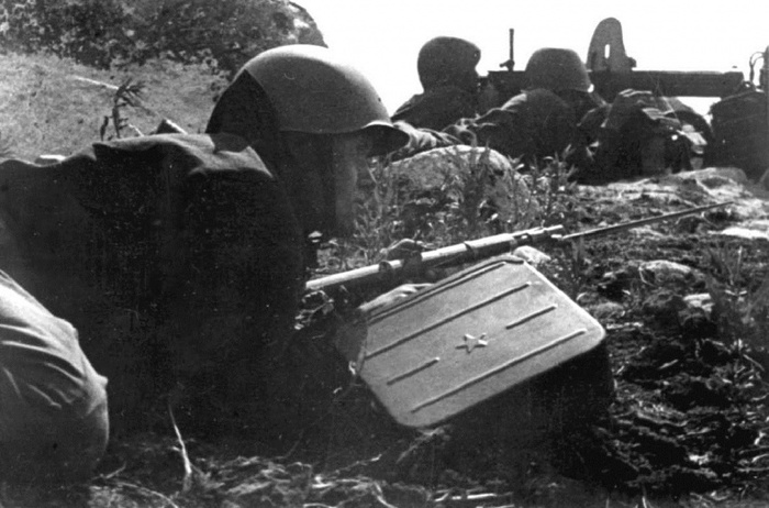 Слева направо: старший лейтенант Александр Михеевич Смирнов (в должности командира батальона 19-го Краснознамённого стрелкового полка 90-й Краснознамённой стрелковой дивизии пропал без вести 26.06.1941 г.), старший лейтенант Артур Александрович Пеллусар,  П.О. Васильев, красноармеец Рубен Карапетович Погосян. Из наградного документа: «за образцовое выполнение боевых заданий Командования на фронте борьбы с финской белогвардейщиной и проявленную при этом доблесть и мужество» награждены: Смирнов — орденом Красного Знамени, Пеллусар и Погосян — орденами Красной Звезды.  1939 г.