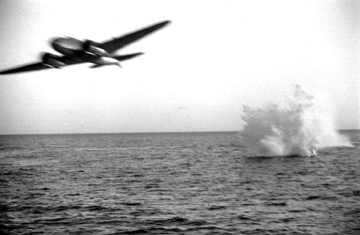 Самолет Ил-4 из состава 9-го гвардейского минно-торпедного авиаполка ВВС Северного флота ставит дымовую завесу над судами полярного конвоя. 1944 г.