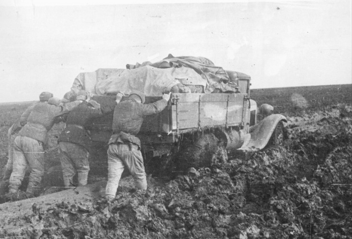 Красноармейцы выталкивают грузовик ГАЗ-АА, застрявший на раскисшей дороге под Кривым Рогом. 1944 г.