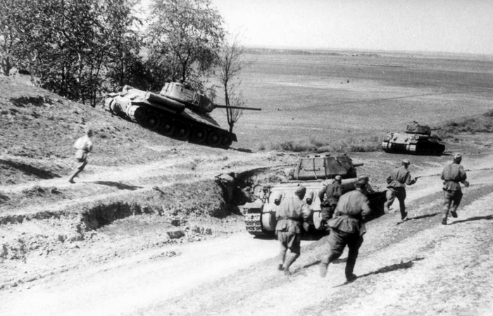Советская пехота при поддержке танков Т-34-85 в бою на подступах к Вене. 1945 г.