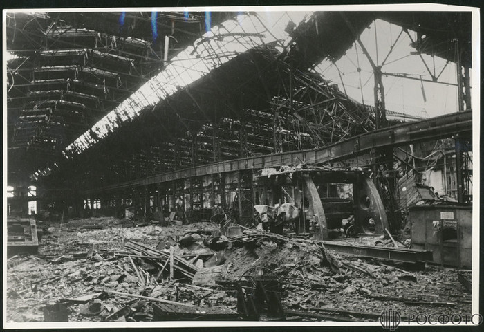 Ижорский завод. Прокатный цех после артобстрела. 1942