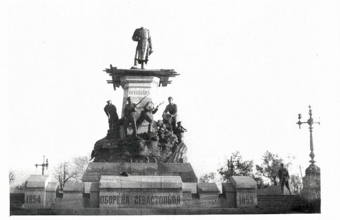 У памятника Эдуарду Тотлебену. Дата съемки: 1944 год