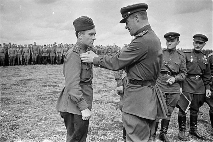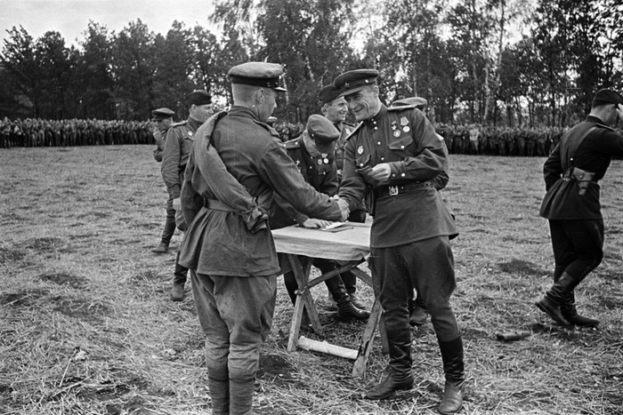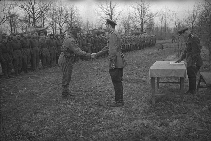 Танковые части полковника Каневского. Награждение. Дата съемки: сентябрь 1944. 2-я танковая армия. 6-й отдельный гвардейский танковый полк прорыва.