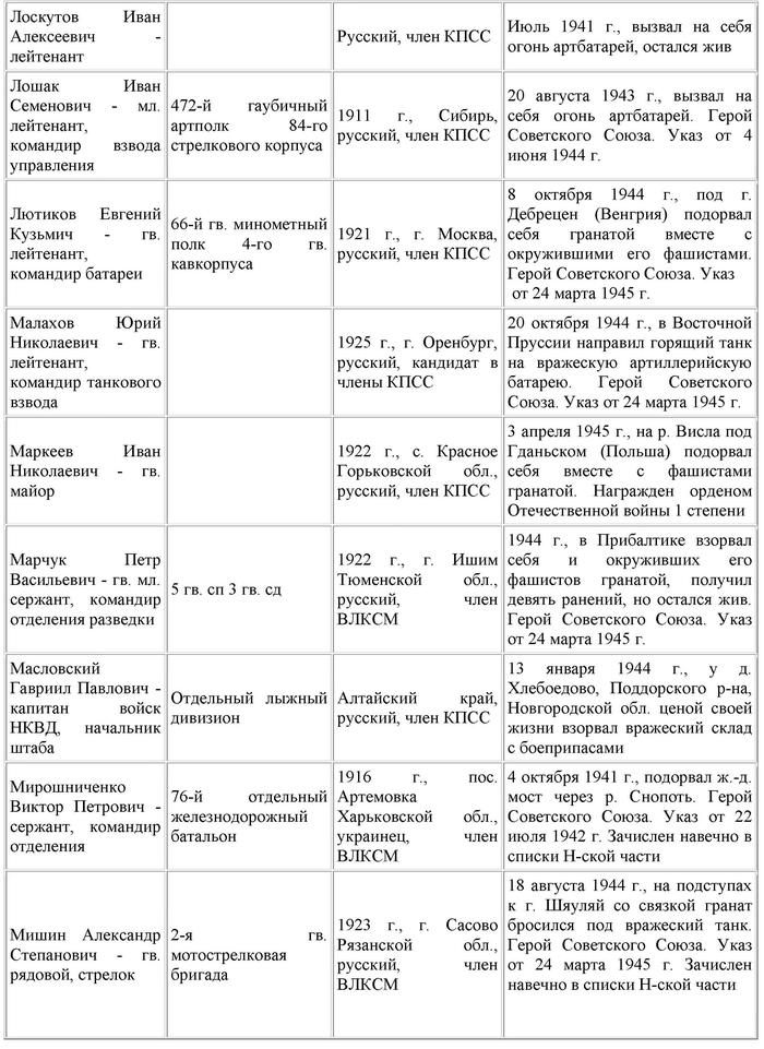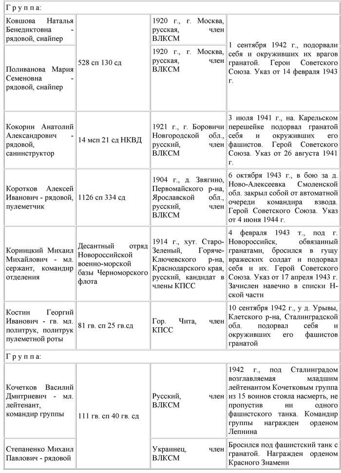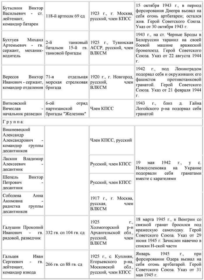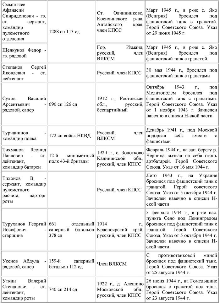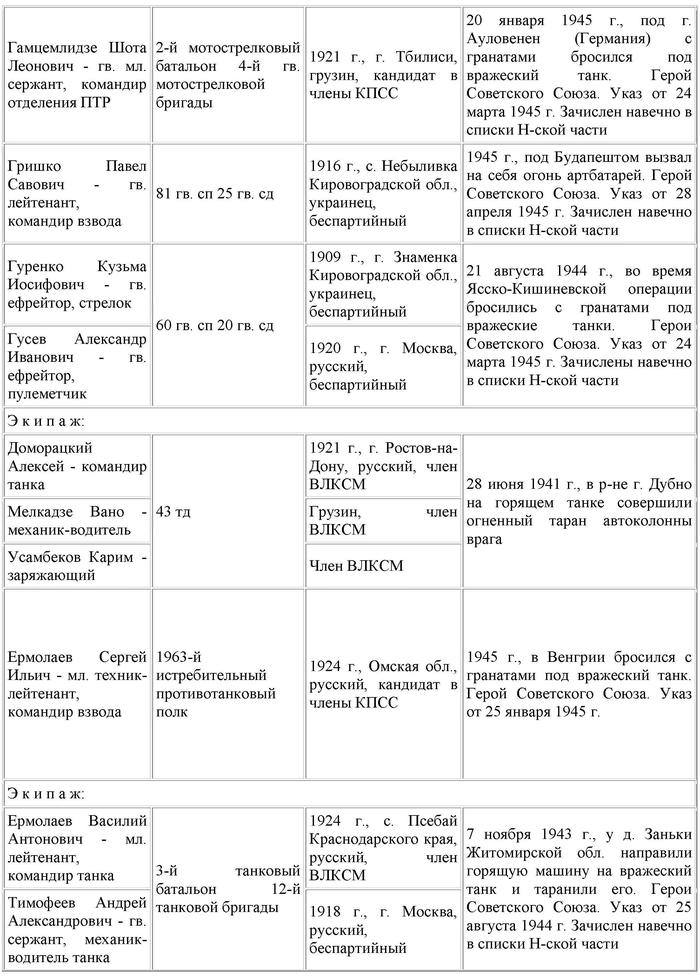 Фамилии воинов, вызвавших огонь на себя, бросившихся под вражеские танки со связками гранат или взорвавших себя вместе с фашистами, даются в алфавитном порядке (группы по фамилиям старших групп). Список составлен на основе материалов, хранящихся в Архиве Министерства обороны СССР и Архиве Министерства внутренних дел СССР. В него не включены имена героев, на которых отсутствуют точные данные.