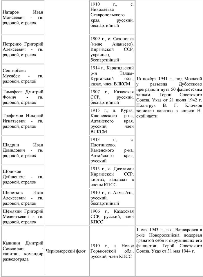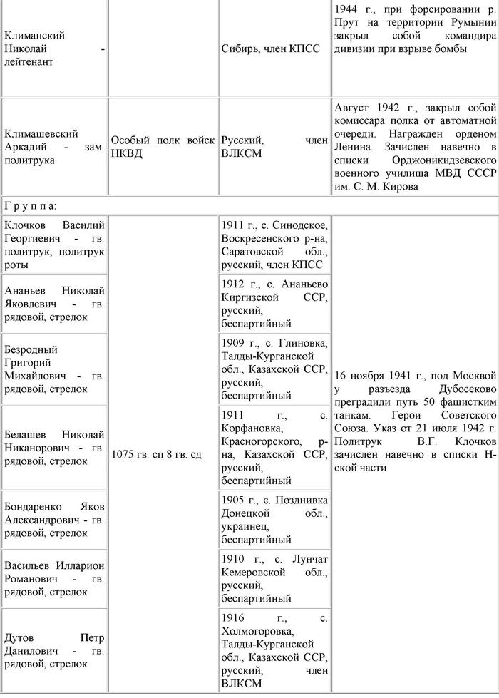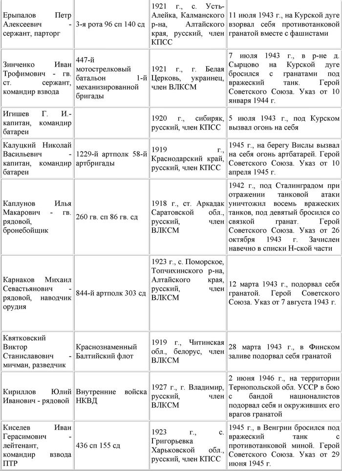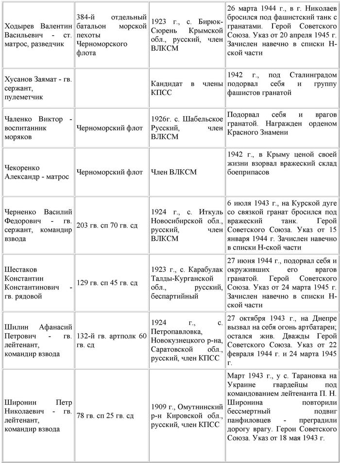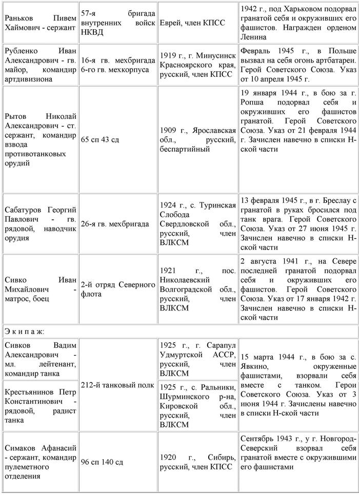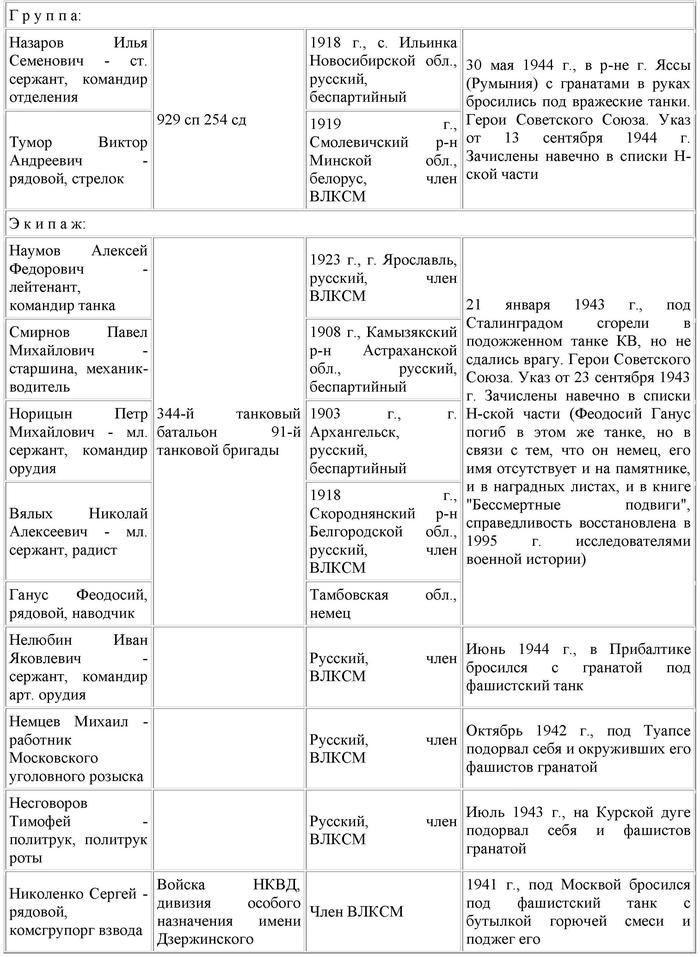 Фамилии воинов, вызвавших огонь на себя, бросившихся под вражеские танки со связками гранат или взорвавших себя вместе с фашистами, даются в алфавитном порядке (группы по фамилиям старших групп). Список составлен на основе материалов, хранящихся в Архиве Министерства обороны СССР и Архиве Министерства внутренних дел СССР. В него не включены имена героев, на которых отсутствуют точные данные.