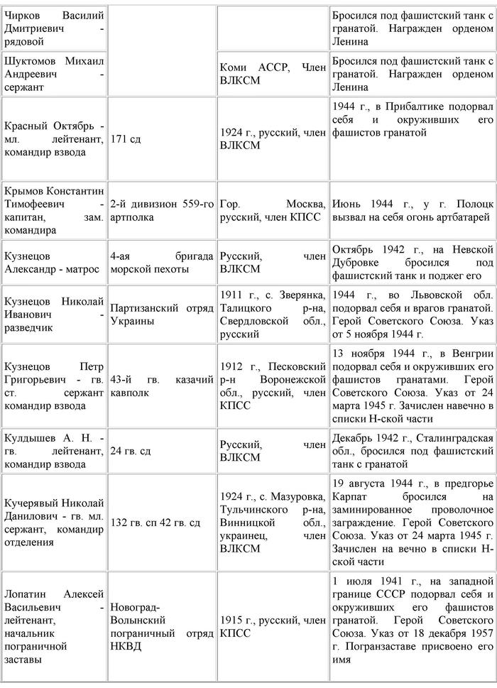 Фамилии воинов, вызвавших огонь на себя, бросившихся под вражеские танки со связками гранат или взорвавших себя вместе с фашистами