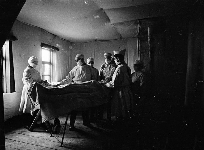Главный врач Николай Бурденко в операционной. Дата съемки: 1943 год. Полевой госпиталь.
