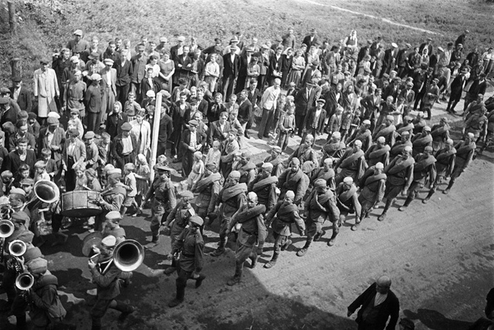 Колонна советских войск входит в польский город Жешув под звуки военного оркестра.