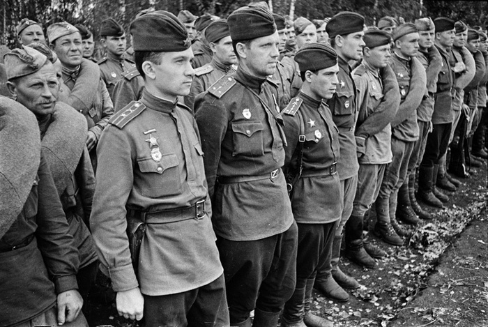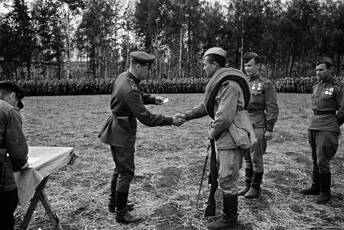 Общее построение. Вручение майору Карнаковскому и другим воинам боевых наград. Из серии «1-я гвардейская мотострелковая бригада». Дата съемки: 1943 год