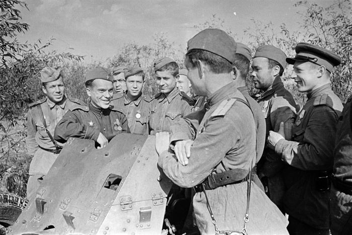 Танковые части полковника Каневского идут в бой. Танкист, награжденный орденом Красной Звезды. Дата съемки: 1944 год