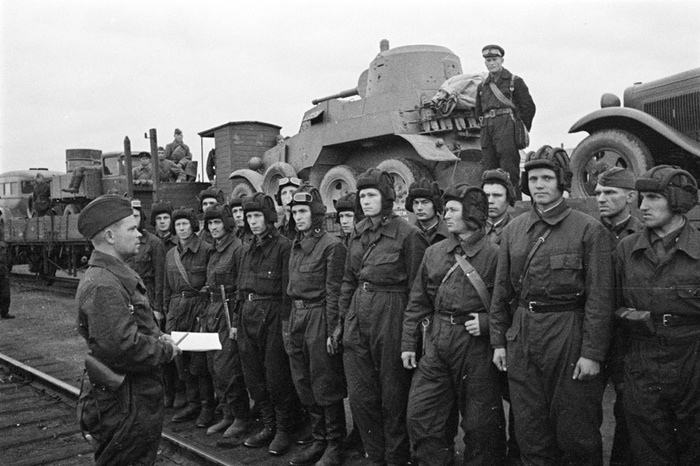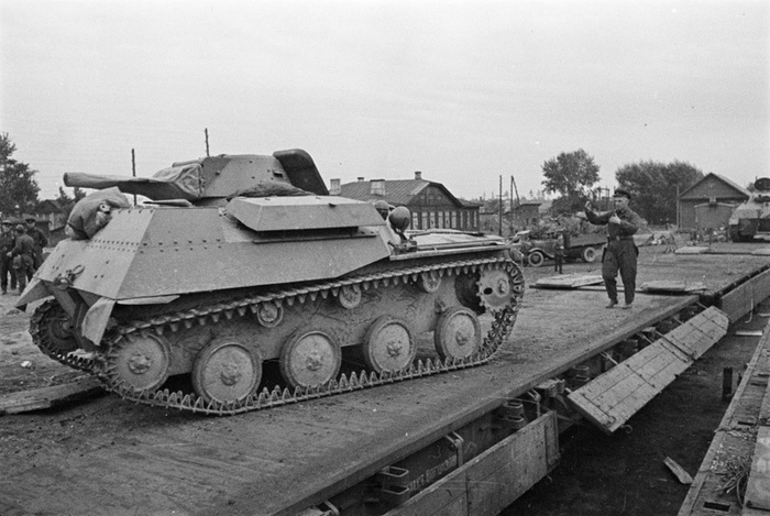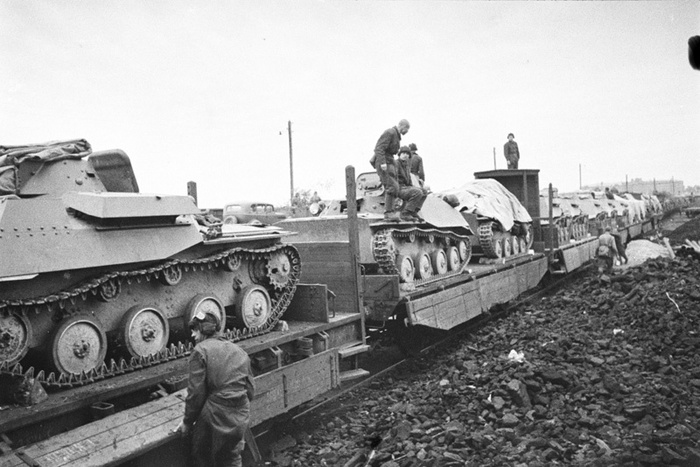Отправка танков и техники на фронт под Москвой. Дата съемки: 1941 год