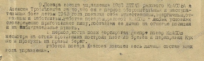 Наградные листы есть у поваров. «Мужественным, энергичным, отважным и заботливым, - характеризует командир повара 1852-го истребительно-противотанкового артиллерийского полка, рядового Алексея Трофимовича Квасова (1906 г.р.) из Соусканихи, в представлении к медали «За боевые заслуги». Красноармеец в любых условиях своевременно приготовлял пищу и лично доставлял ее на огневые позиции и наблюдательные пункты. А во время форсирования полком реки Днепр А.Т. Квасов, несмотря на огонь противника, построил плот из бревен и переправил кухню и продукты на другой берег.