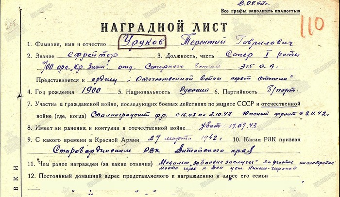 А иногда читаешь чей-то наградной лист, привычно скользишь взглядом по той самой графе и все-таки ударяешься об это страшное слово… «Убит 17.07.1943 г.», - аккуратно выведено синими чернилами в представлении к награде ефрейтора Терентия Гавриловича Урукова (1900 г.р.) из Старой Барды. Следуя в группе разграждения в составе 362-го стрелкового полка во время наступления в районе урочища Бородинский Кут, находился в первых рядах. Однако продвижение частей Красной Армии было задержано проволочным заграждением противника, а подходы к нему обстреливались из пулемета. Несмотря на ураганный огонь с немецкой стороны, Т.Г. Урукову удалось приблизиться к «колючке» и проделать проход длинной 12 метров. Во время работы наш земляк был смертельно ранен, но поле боя не покинул и продолжил резать проволоку… А 8 августа вышел приказ о награждении Т.Г. Урукова орденом Отечественной войны II степени, где в косых скобках, рядом с именем-отчеством, было слово «Посмертно» … Но есть еще одна деталь, которая привлекла мое внимание именно к этому наградному листу – это траурная рамка, аккуратно нарисованная черным карандашом вокруг фамилии Терентия Гавриловича. Среди множества просмотренных мной представлений к наградам подобное я увидела впервые. Ведь все-таки наградной лист – это документ и так, конечно же, не принято, но иногда можно…