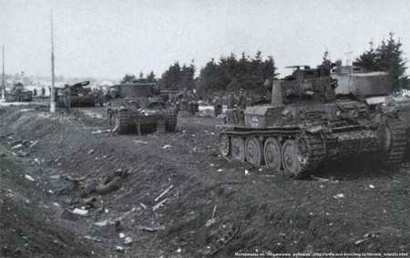Открыли огонь по бронированным машинам противника и наши 76-мм орудия. Это дивизион Прокопова, со старыми трехдюймовыми орудиями образца 1898 года с наклепанными на стволах латунными орлами, расположился на опушке леса южнее шоссе. Возле командного пункта ПАУ в редком лесу вблизи противотанкового рва занимало позиции 45-мм противотанковое орудие Карасева и 76-мм дивизионная пушка образца 1902/30 года капитана Базыленко.