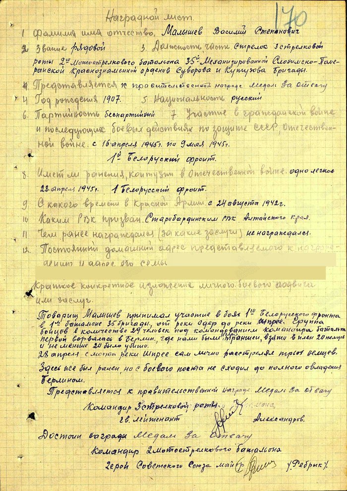 Наградной лист военнослужащего имел официально утвержденную форму, где кроме указания анкетных данных (ФИО, звание, должность, год рождения, национальность, партийность, участие в боевых действиях, наличие ранений и контузий, наград, постоянный домашний адрес представляемого к награде и адрес его семьи) обязательным было заполнение самого главного раздела «Краткое, конкретное изложение личного боевого подвига или заслуг». На основании этого листа издавался приказ о награждении красноармейца медалью или орденом.