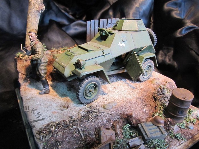 Подбитые советские танки ХТ-130 и Т-34 из состава 6-го механизированного корпуса и тела погибших танкистов на дороге у поселка Озерницы. На заднем плане горит немецкий грузовик Krupp L3H163. Танки были подбиты севернее трассы Зельва — Слоним 29-30 июня 1941 года во время боя с частями немецкой 29-й пехотной дивизии