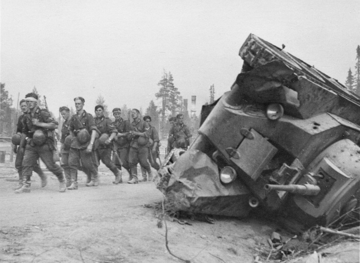 Немецкая пехота проходит мимо подбитого в районе Смоленска советского лёгкого танка БТ-7