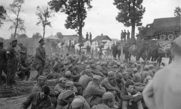 Пленные советские солдаты и офицеры, захваченные в первый день войны. Возле моста через Сан, город Ярослав