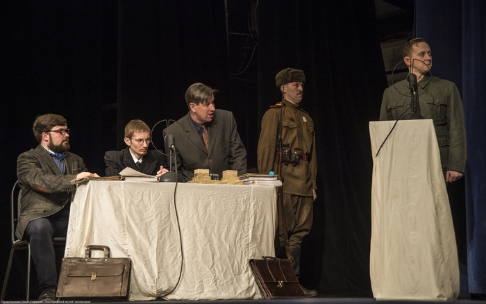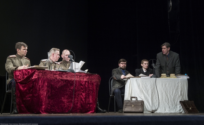 «К сожалению, из-за нехватки источников — пока все 54 тома обвинения новгородского процесса, хранящиеся в Москве в центральном архиве ФСБ, не рассекречены — кое-какие моменты приходилось восстанавливать из документов других аналогичных судов, проходивших в СССР до Новгорода. Конечно, технологически сложно из 10 дней процесса сделать выжимку на два часа постановки. Но мы пытались выстроить единый рассказ, чтобы он был и документальным, и эмоциональным, что особенно важно: с одной стороны, он полностью соответствует историческому событию, с другой — даёт современному зрителю эмоцию, то, чего нет в сухих цифрах архивных материалов», — рассказал новгородский учёный, кандидат исторических наук Дмитрий Асташкин.