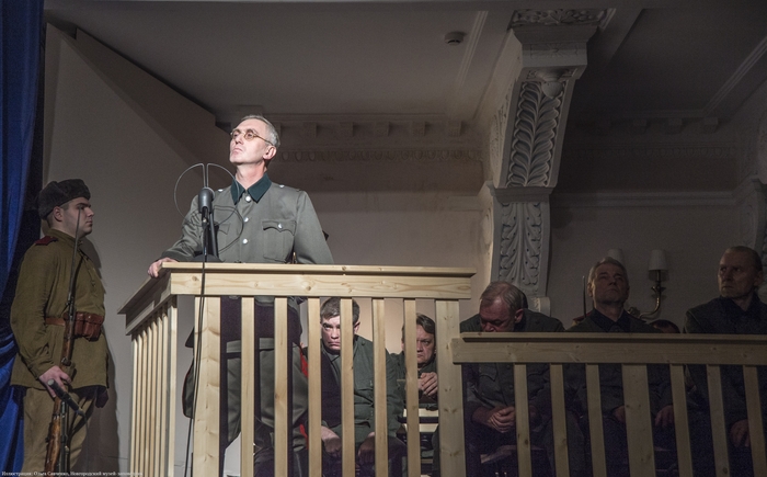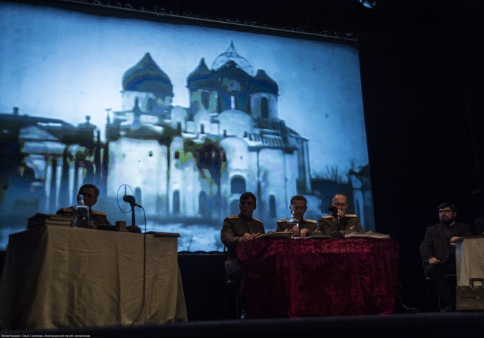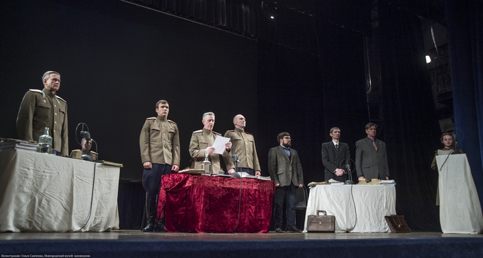 Постановка «Да судимы будете», премьера которой состоялась 16 декабря в Новгородском кремле, в здании областной филармонии — не спектакль. Происходящее в этих же самых стенах ровно 70 лет спустя организаторы назвали сценической реконструкцией, ведь домыслов — не более 10%, и то лишь эмоции, которые с трудом находились в рассекреченных архивах ФСБ, в газетных публикациях того времени, в редких фотоснимках и кадрах кинохроники, в уникальных воспоминаниях очевидцев.