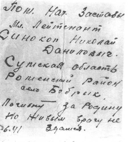 В эти первые часы боя комсомолец Синокоп поклялся стоять насмерть, но не пропустить врага. Он вынул свой медальон и записал слова клятвы на том же листочке, на котором были записаны его фамилия и место рождения.