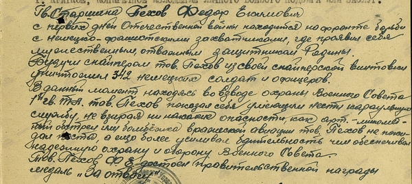 В конце ноября 1941 года командир отделения комендантской роты 15-го отдельного батальона охраны полевого управления 29-й Армии сержант Ф. А. Пехов представлен командованием части к награде за уничтожение из снайперской винтовки более 50 солдат и офицеров противника.