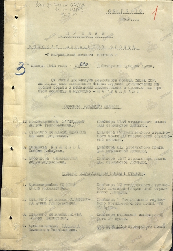 Приказ о награждении орденом Красной Звезды
