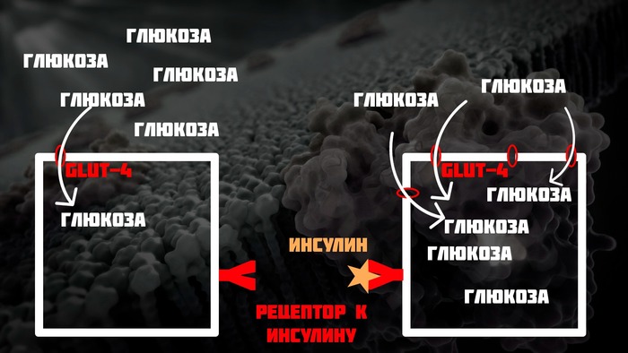 Один из важнейших механизмов действия инсулина - это встраивание в мембрану клетки специального глюкозного транспортера (GLUT-4). Этот процесс можно сравнить с очередью в супермаркете: покупатели (молекулы глюкозы) выстраиваются в длинную очередь, которая очень медленно движется. Однако всем на радость приходит менеджер (инсулин) и открывает еще 10 касс: процесс прохождения глюкозы через кассовую линию (внутрь клетки) значительно ускоряется.