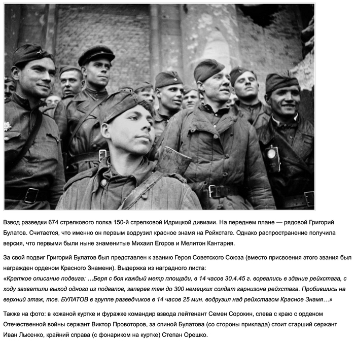 Фотожурналисты и кинооператоры у Рейхстага. Слева на право, первый ряд: Г. Самсонов, А. Морозов, Ф. Кислов, Л. Железнов, И. Шагин, О. Кнорринг; второй ряд: С. Альперин, А. Капустянский, Г. Петрусов, Р. Кармен; третий ряд: А. Архипов, М. Редькин, Н. Фиников