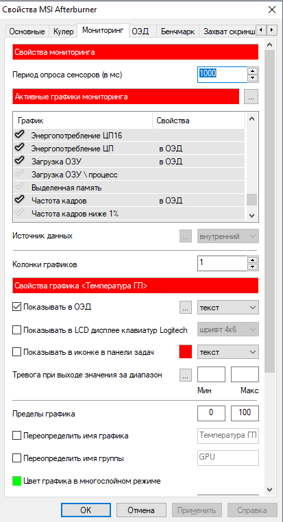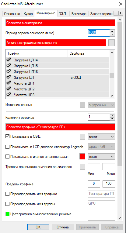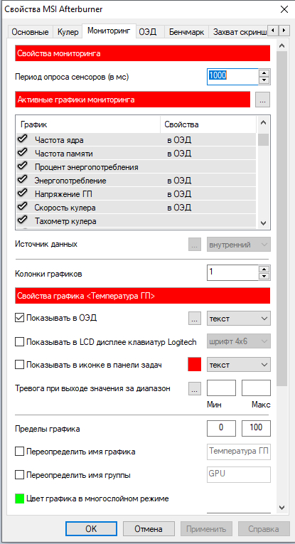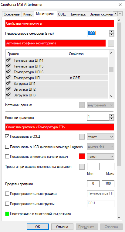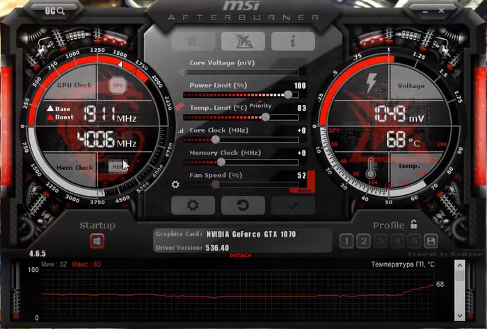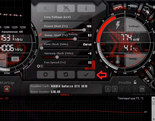 После чего, не закрывая график, нажимаем в Afterburner кнопку применить.