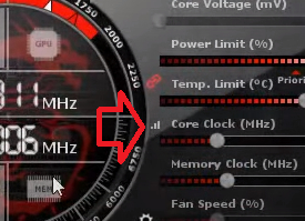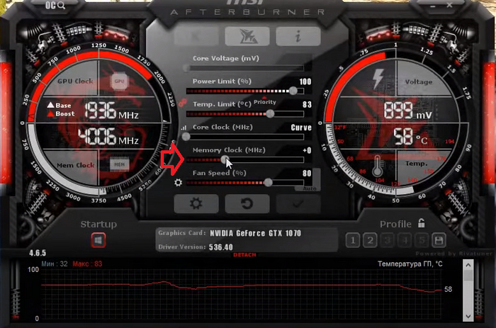 После того, как вы подберёте оптимальное напряжение и частоту ядра. Можно разогнать память, для этого добавляем по 200 мегагерц ползунком Memory Clock и тестируем в бенчмарке.