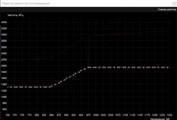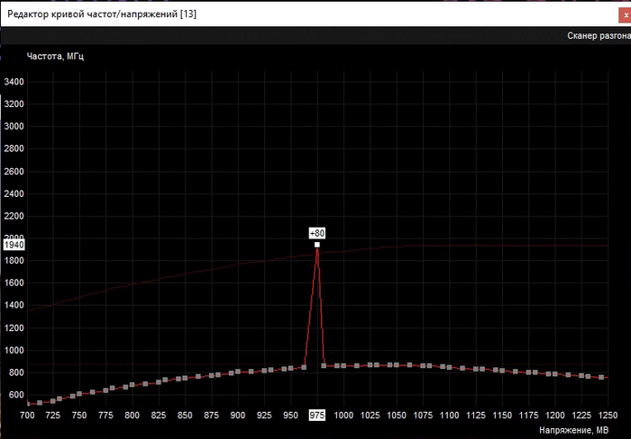 После чего поднимаем соответствующий этому напряжению квадратик на ту частоту, которую хотите поставить. Например у нашей карты по дефолту идёт 1940 мегагерц при напряжении 1 вольт.