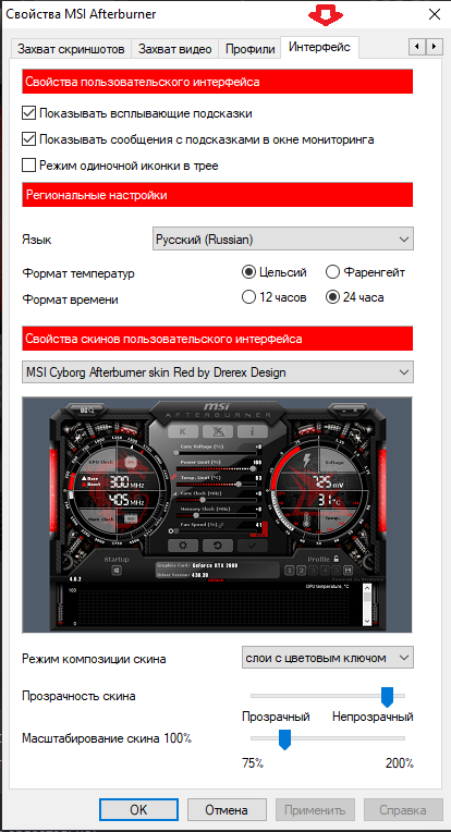 Примечание: ваш интерфейс Afterburner может выглядеть иначе, чтобы выбрать понравившийся вам интерфейс, перейдите на вкладку "Интерфейс"