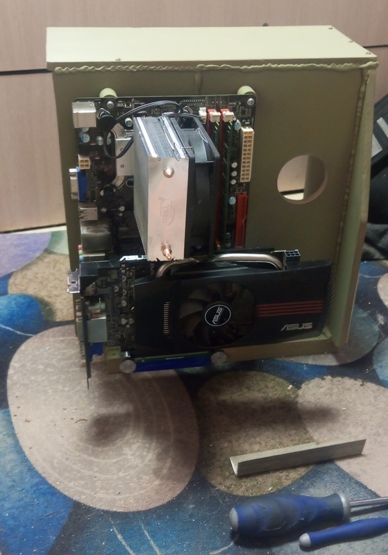 Питание и мамка всякие кронштейны. Видеокарточка воткнута через ризер, самый не дорогой за 20 баксов.
