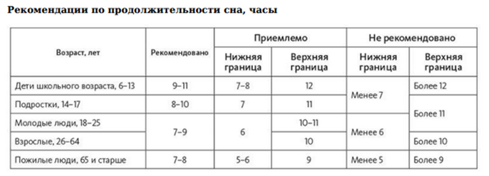 Напоследок приведу еще таблицу с рекомендациями по продолжительности сна. Обратите внимание, что больше 10 часов спать вредно =) Кстати, если вы сова и на выходных отсыпаетесь, то рекомендуется, чтобы сон был не длиннее, чем на 2 часа в будни, чтобы не сбивать циркадные ритмы. То есть если в будни вы встаете в 7, то в выходной рекомендуется вставать не позже 9.