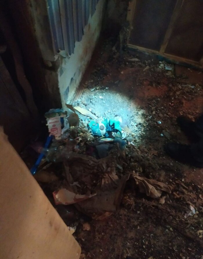 Все крысы очень осторожные, зашуганные, все живут в подполе и в стенах, в которых прогрызли много ходов и устроили там гнёзда. Квартира завалена мусором, старой, сгрызанной мебелью и тонной фекалий, как крысиных, так и собачьих. Прежде, чем начать ловлю, ребятам пришлось сгребать весь мусор и выносить на помойку в больших мусорных мешках. В квартире отсутствует частично свет, так как крысы сгрызли проводку, и это тоже очень усложняло отлов. Работать приходилось с фонарями и прожектором. Запах в квартире стоит нестерпимый настолько, что режет глаза.