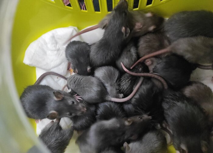 Мы забрали 29 крыс, в основном это совсем малыши возрастом 1 месяц, но есть и взрослые. Крысы истощённые, грязные, содержались в жутких условиях в микрокарцерах.